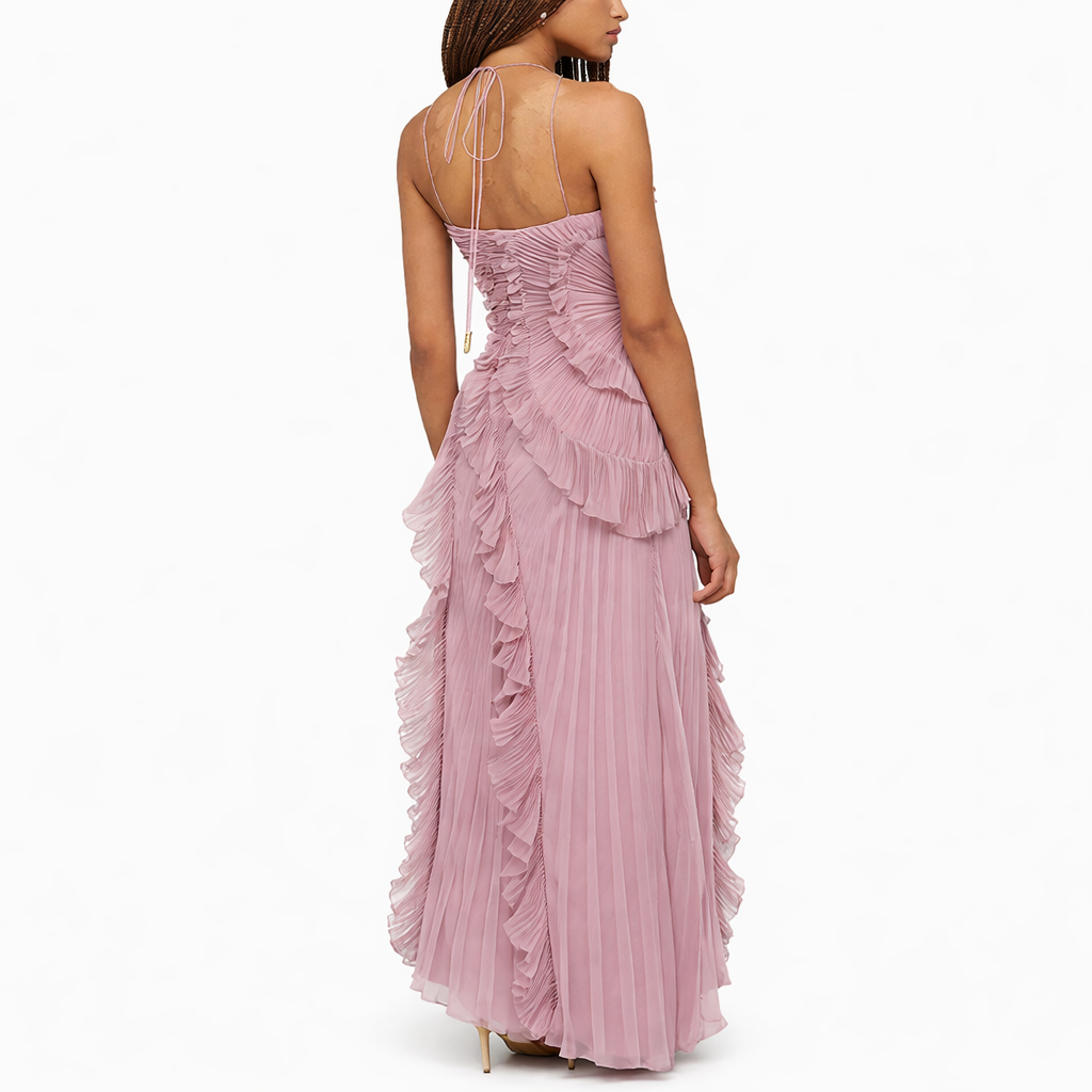 -Plisado fluido que estiliza la silueta y alarga visualmente la figura.